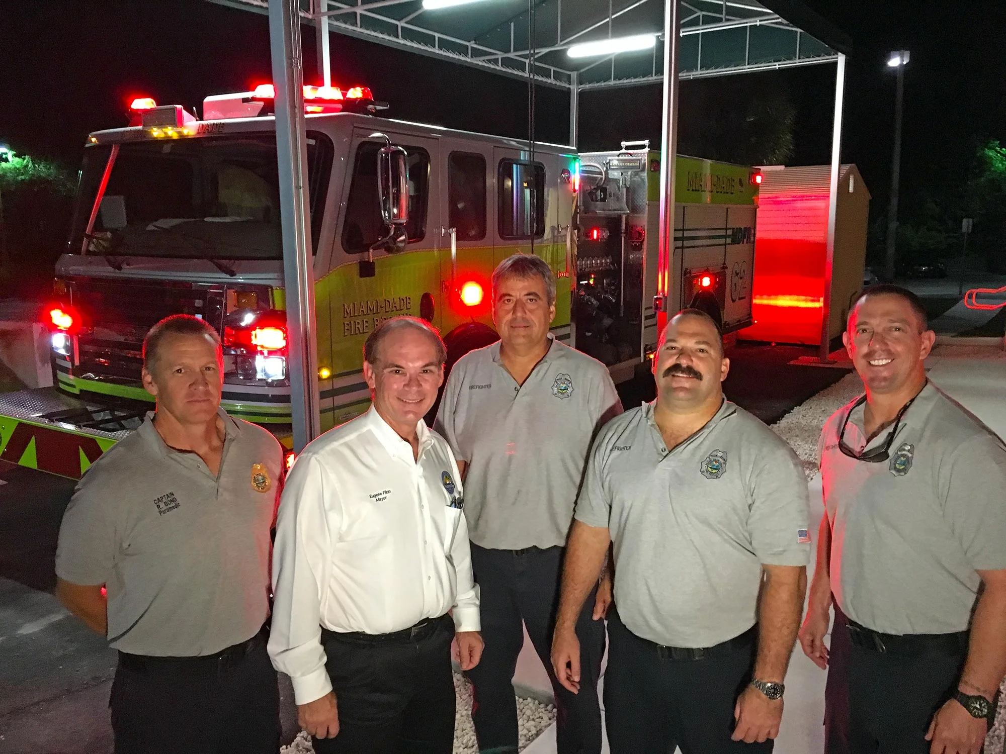 [L to R] Miami-Dade Fire Rescue Captain Rick Bond, Palmetto Bay Mayor Eugene Flinn and members of “C” Platoon Shift man Station 62