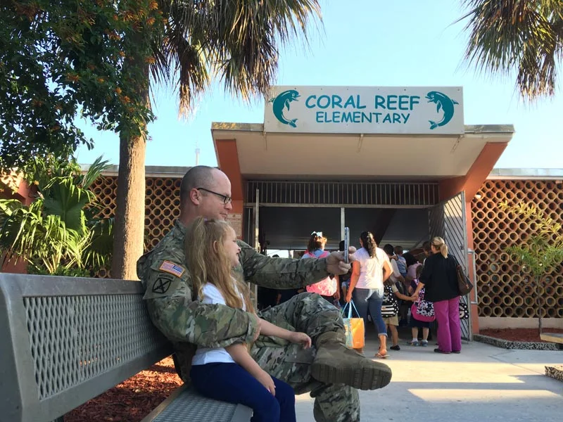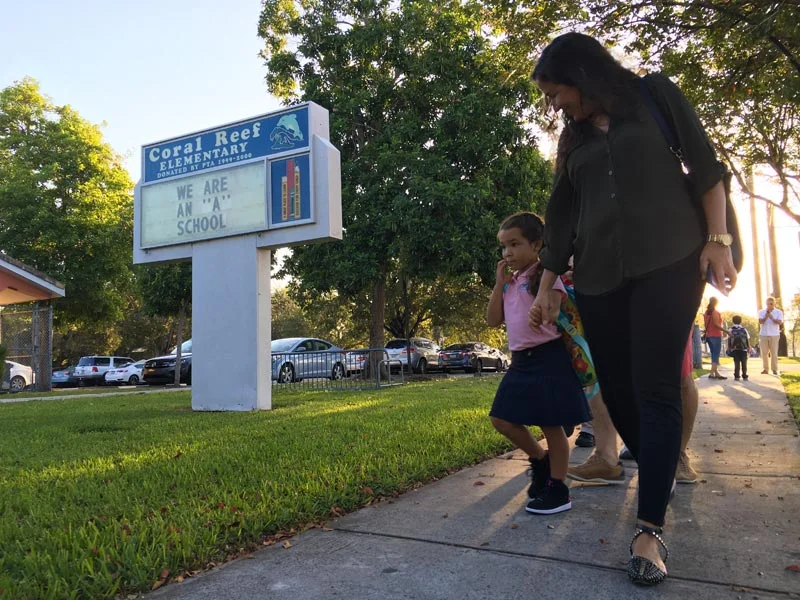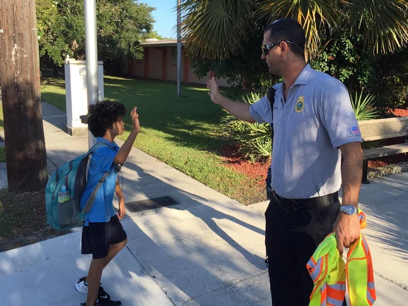 At Coral Reef Elementary, both the fire and police departments were on-hand to help parents drop off their little ones. Lt. Gary Windsor from Engine Company 4 even high-fived children as they made it onto school grounds.