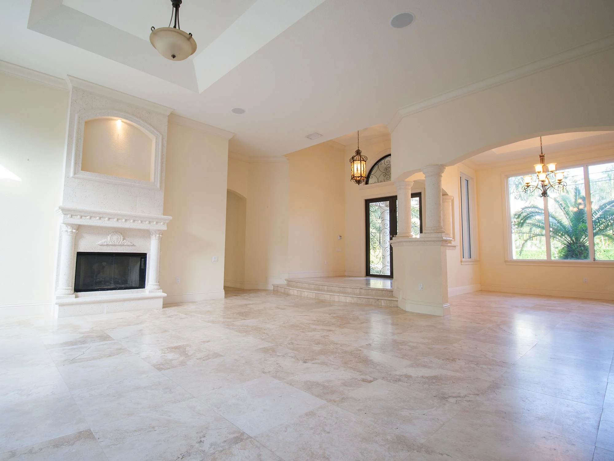Elegant and grand impact-door entry to cavernous living/great room with working fireplace.