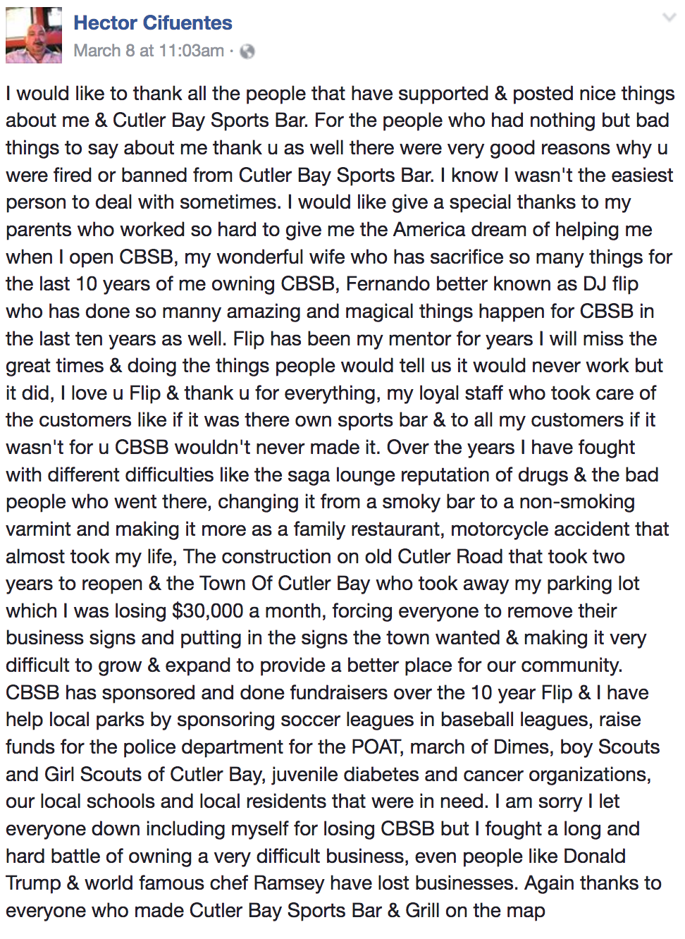 Cutler Bay Sports Bar & Grill was a neat haunt for people who liked inexpensive drinks, decent food and local music. I frequented the bar several times a year. Sad to see it go. RIP Cutler Bay Sports Bar & Grill :(