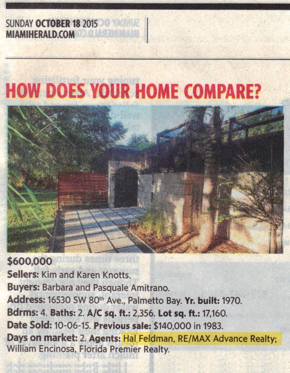 I did it again! I am proud to report that on Sunday, October 18, 2015 I was recognized in the Miami Herald's "How Does You Home Compare?" column.